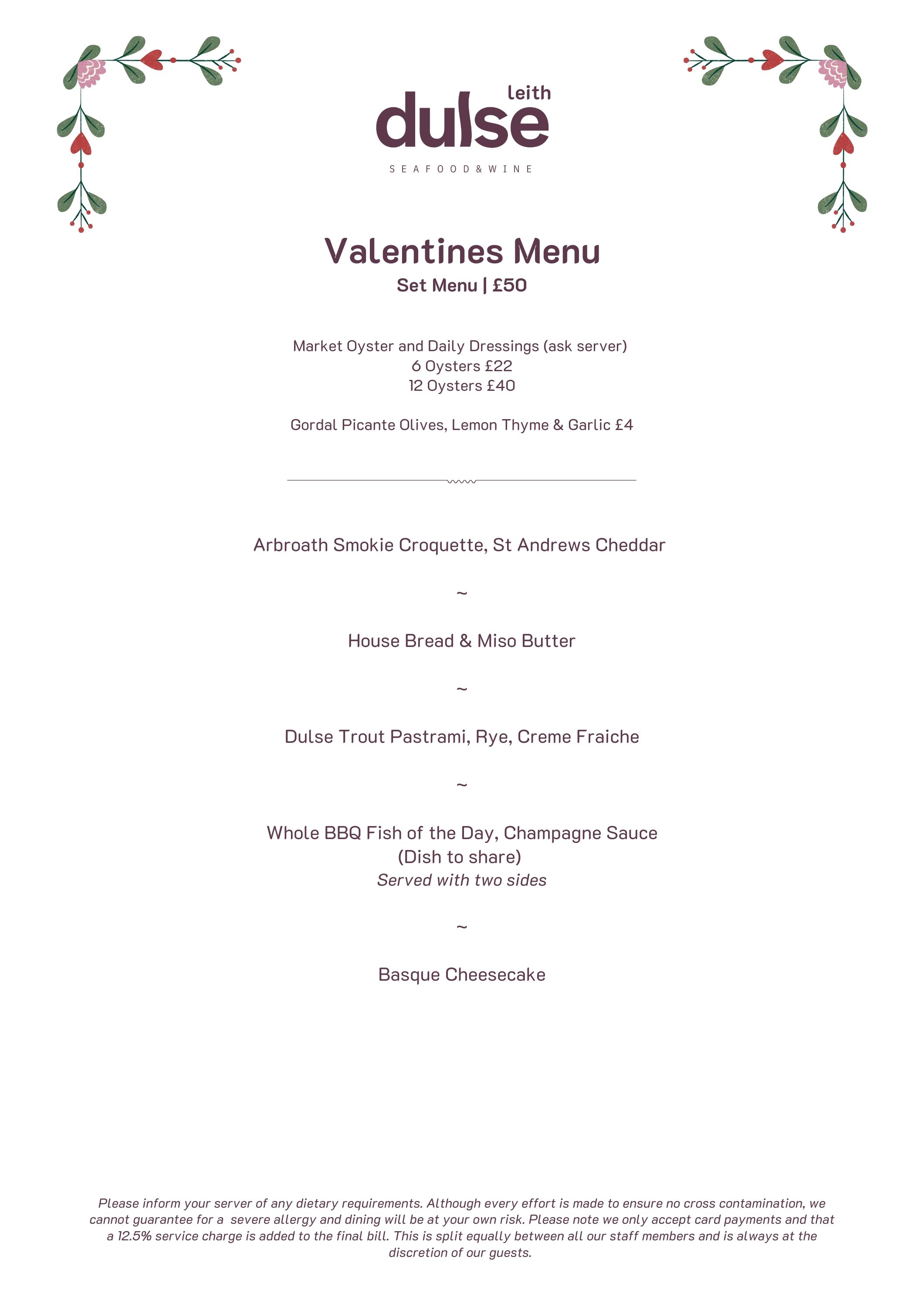 This Valentine’s Day, treat the one you love to an unforgettable experience at Dulse Leith. Whether you've travelled to Leith from afar or live just around the corner, our warm and inviting atmosphere makes the perfect setting for a romantic meal to celebrate love.